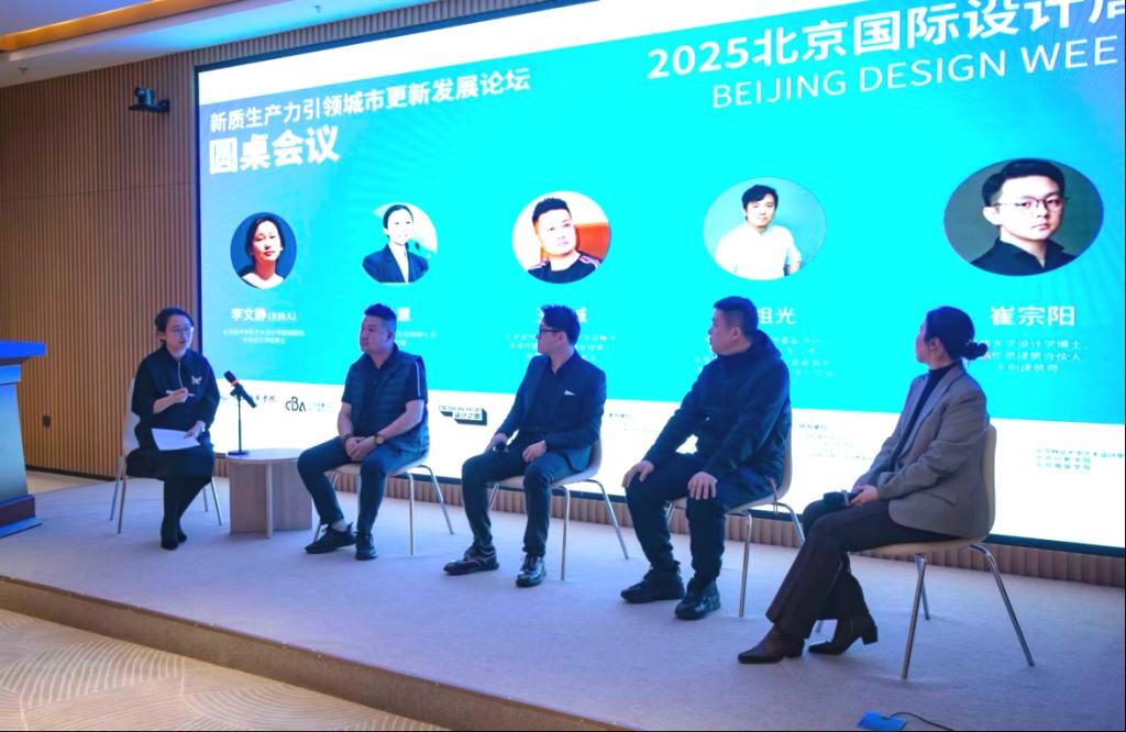 在圆桌对话环节,来自产业、教育、设计与研究领域的四位嘉宾展开了精彩对谈:北京怡禾生物工程有限公司总经理孙慧女士分享了工业遗存空间改造与运营经验,强调“记忆延续、功能重生”在城市更新中的商业价值与社会意义;北京城市学院教师,前京东集团营销总监王金成博士,从平台经济与算法逻辑出发,提出了“体验驱动、场景活化”是激发城市消费活力的关键;北京化工大学校团委副书记冯祖光展示了智能科技与文化基因在城乡更新中的创新应用等前沿探索案例;UCA优思建筑合伙人、主创建筑师崔宗阳博士分享了从实体空间更新到虚拟场景构建的“双向实践”,指出元宇宙、游戏化交互将成为传播城市文化、提升国际影响力的新载体。