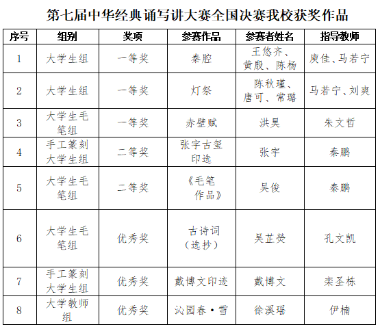近日,第七届中华经典诵写讲大赛全国决赛获奖名单正式公布,我校选送的8项作品斩获一、二等奖及优秀奖。其中,表演学部学生王悠齐、黄殷、陈杨的朗诵作品《秦腔》和陈秋瑾、唐可、常璐的朗诵作品《灯祭》双双斩获“诵读中国”经典诵读大赛大学生组一等奖,教育学部学生洪昊的毛笔作品《赤壁赋》获“笔墨中国”汉字书写大赛大学生毛笔组一等奖,表演学部教师庾佳、马若宁、刘爽及教育学部教师朱文哲获优秀指导教师奖,充分展现了我校师生的文化底蕴与专业风采。