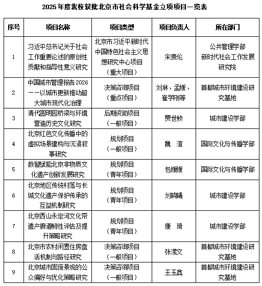 近日,北京市社科联、北京市社科规划办公布了2025年度北京市社会科学基金项目评审结果,我校9个项目获批立项。近年来,学校启动新型智库高质量建设,搭建开放式跨学科智库平台,提前整合布局,强化项目孵化,加强申报指导,严把出校资格,获批北京市社会科学基金项目立项数量继续保持良好态势。