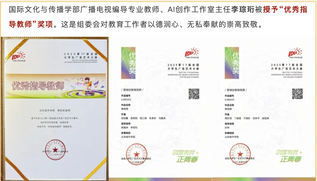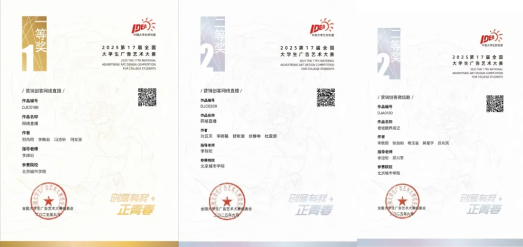 12月6日,第17届全国大学生广告艺术大赛学科竞赛成果展示盛典于北京全国政协礼堂举行。本届大赛共有58万余组作品参赛,经过多轮严格评审,北京城市学院国际文化与传播学部本硕师生团队在本次大赛竞赛中荣获国家级一等奖1项、二等奖2项、个人单项一等奖1项、优秀奖2项、优秀指导教师奖1项。这些奖项集中展现了北京城市学院国际文化与传播学部师生扎实的专业素养、优秀的创意能力。