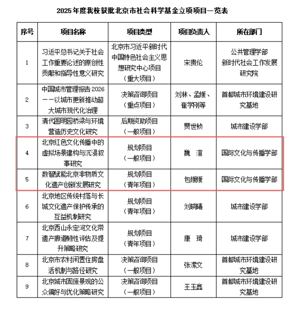近日,北京市社科联、北京市社科规划办正式公布2025年度北京市社会科学基金项目评审结果,北京城市学院国际文化与传播学部两个项目获批立项。