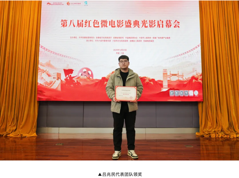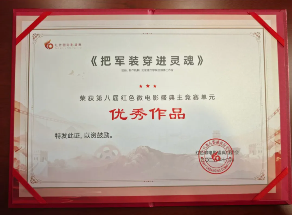 近日,第八届中国红色微电影盛典推优典礼在“红军的摇篮、将军的故乡”安徽金寨圆满落幕。由北京城市学院国际文化与传播学部邓兴军教授指导,吕兆民、杨玉玺、郝星宇、张加如、宋欣茹等学生制作,全媒体工作室出品的纪录片《把军装穿进灵魂》,从全国2100余部参赛作品中脱颖而出,荣获优秀作品奖,彰显了北城学子在红色文化创作领域的扎实功底与青春担当。