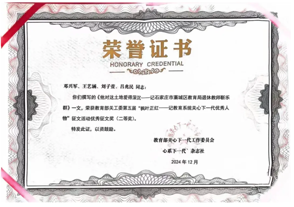 近日,北京城市学院国际文化与传播学部邓兴军、王艺涵、刘子萱、吕兆民师生团队创作的《他对这土地爱得深沉——记石家庄市藁城区教育局退休教师靳乐群》一文,正式刊登于教育系统关心下一代委员会《心系下一代》杂志。此前,该作品已在教育部关工委第五届“枫叶正红——记教育系统关心下一代优秀人物”征文活动中斩获优秀征文二等奖。此成果也是国际文化与传播学部教师邓兴军推进课程项目制教学的代表性实践成果。