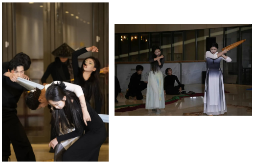 本次演出在艺术中心的公共廊道进行,没有常规舞台与专业灯光,对演员的身体、声音、节奏提出了极高要求。为攻克这一难题,主创团队在表演学部黑匣子排练厅进行了为期七天的高强度集中排练。在“空的空间”中,学生们激发了真实的内在情感,创造出丰富的戏剧意象。