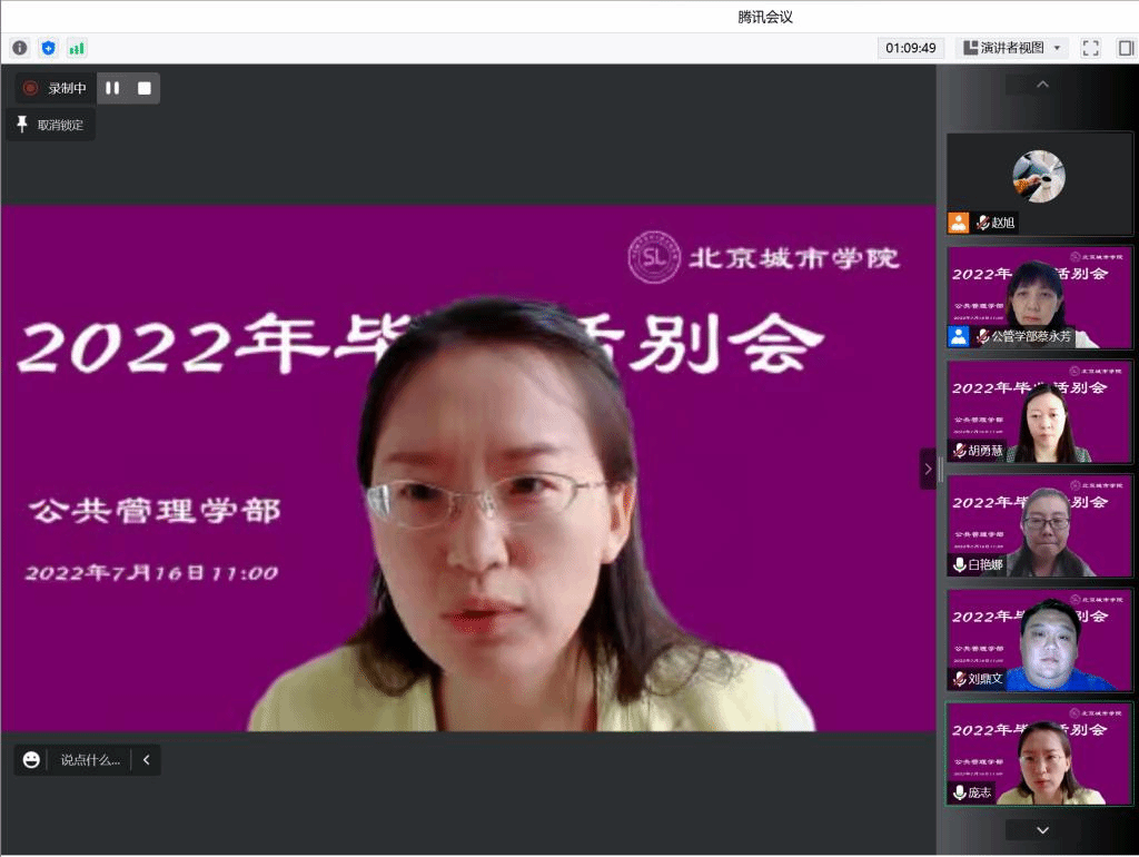 2022年7月16日,公共管理学部线上开展了2022届社工专业毕业生话别会。会议由社会工作专业主任蔡永芳老师主持,学部领导、专业教师、2022届社工专业全体学生参加。党支部书记胡勇慧、班主任白艳娜,专业导师庞志,校友代表刘鼎文分别线上寄语,将祝福定格,将希望定格。