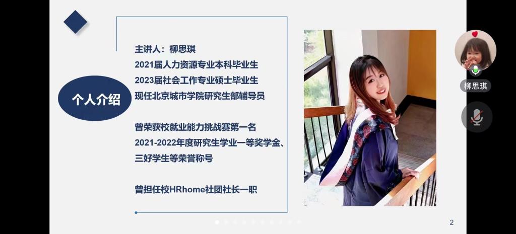 本次讲座邀请了我校2021届人力资源专业本科、2023届社会工作专业硕士毕业生l柳思琪(硕士期间曾获校就业能力挑战赛第一名),为同学们讲解简历制作与面试技巧。