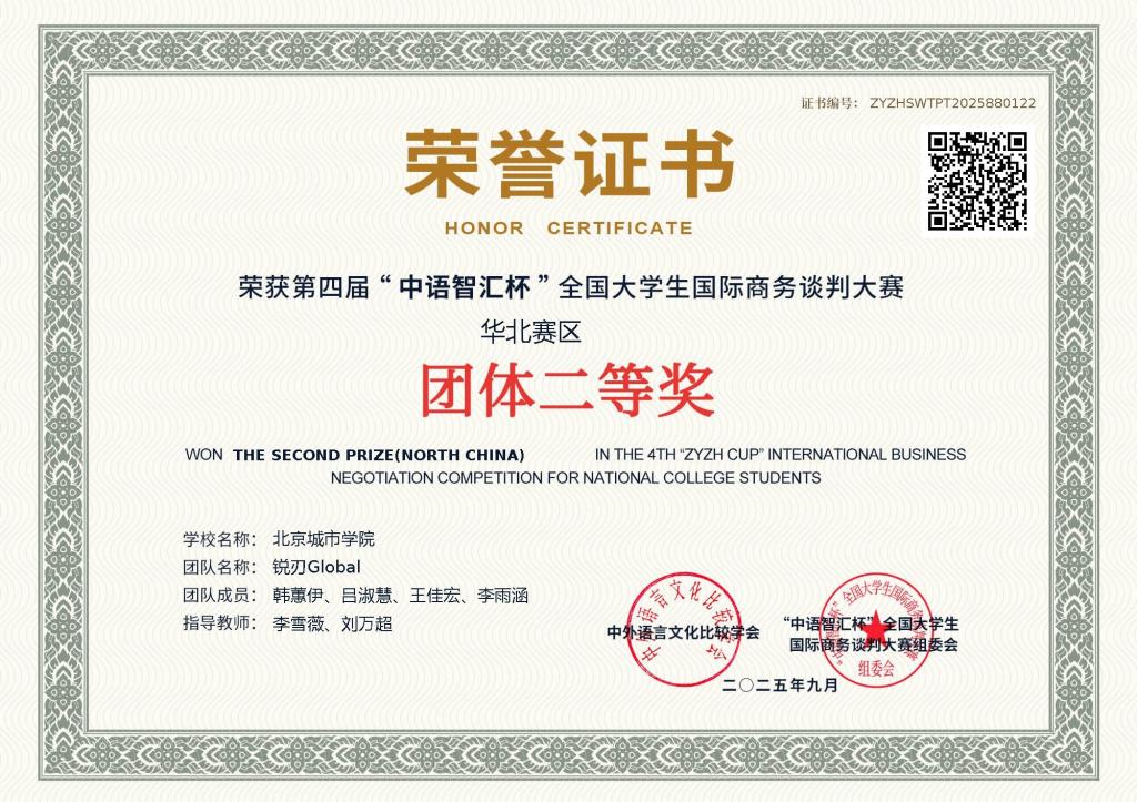 近日,第四届“中语智汇杯”全国大学生国际商务谈判大赛区域赛线上评审工作圆满落幕。我校国际文化与传播学部2022级英语(国际商务)专业学生组成的“锐刃Global”团队,在李雪薇、刘万超两位老师的指导下,凭借扎实的专业素养与出色的英语谈判能力,荣获区域赛二等奖。