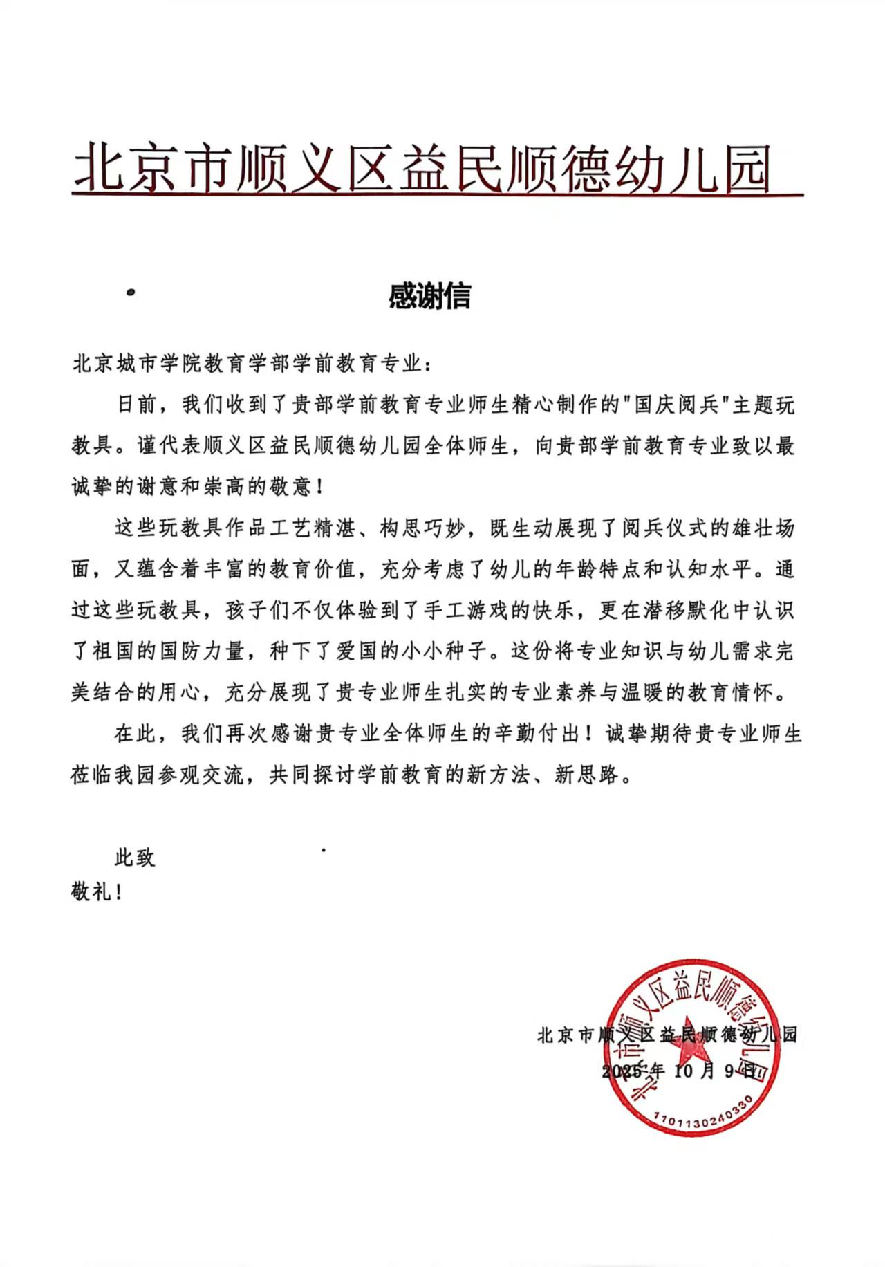 近日,我校教育学部学前教育专业收到益民顺德幼儿园的感谢信,信中对师生研发的国防主题玩教具给予了高度评价。园方特别指出,这批玩教具创新性地将国防教育融入幼儿日常活动,兼具趣味性与教育性,以寓教于乐的方式为孩子们带来了一堂生动而深刻的爱国主义启蒙课。