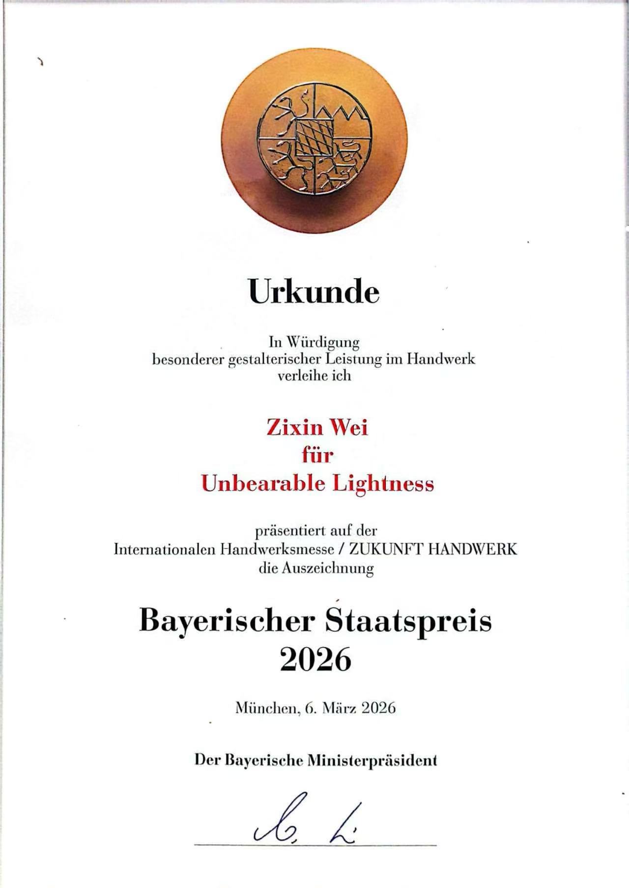 近日,在德国慕尼黑巴伐利亚手工艺协会主办的手工业展(Internationalen Handwerksmesse / ZUKUNFT HANDWERK)上,我校文化遗产学部魏子欣老师凭借当代首饰作品《Unbearable Lightness》,荣获2026年巴伐利亚国家手工艺奖(Bayerischer Staatspreis 2026)。