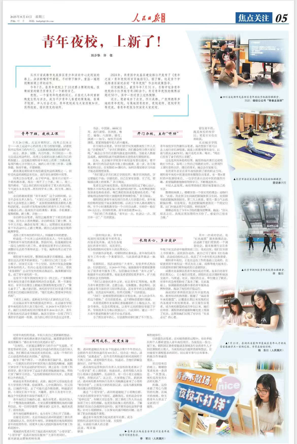 8月13日,我校青年夜校作为全国青年教育创新标杆案例,被《人民日报海外版》以《青年夜校,上新了!》为题进行专题报道。报道聚焦我校青年夜校在课程创新、资源整合与青年服务方面的突出成果,特别强调其“低门槛、高质量、强链接”的办学特色,以及通过国际化视角推动青年全面发展的实践经验。