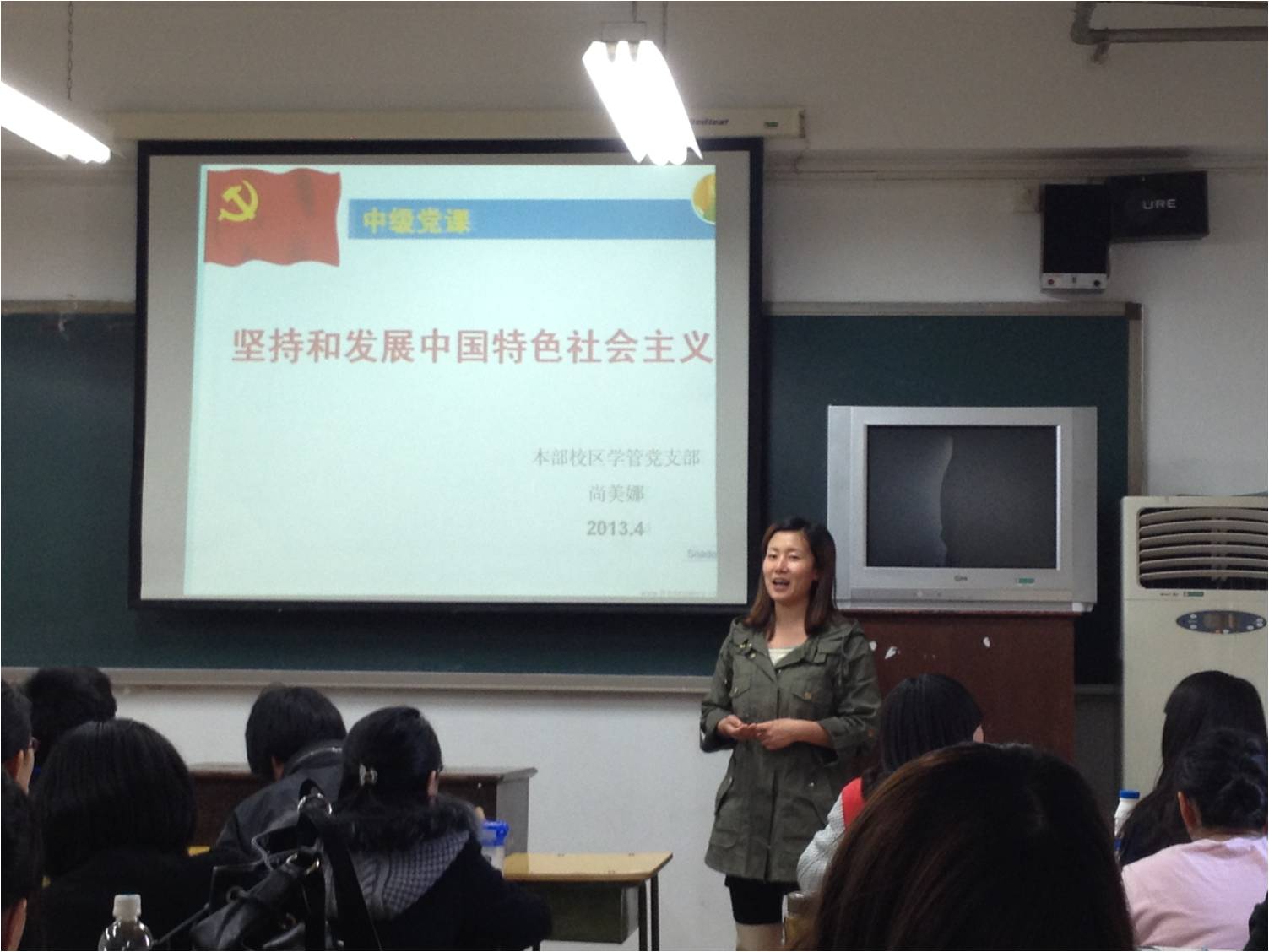 近日,语言党支部于校本部一教601教室组织本学期第三次中级党课学习,主题为《坚持和发展中国特色社会主义》,由本部校区学管党支部组织委员尚美娜老师主讲。学生党员、预备党员和入党积极分子参加了本次党课学习。