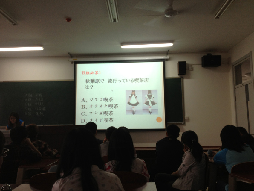 为了丰富同学们的业余文化生活,拓展同学们的知识面,调动同学们学习日语的积极性,营造良好的学习氛围,5月8日晚在城北校区综合楼607教室举办了2013年国际学部首届日本文化知识竞赛。本次竞赛采取趣味竞猜的方式帮助广大学生扩大知识面、了解日本文化。竞赛分为必答题,抢答题,风险题三个环节,共有5个小组的学生参赛,他们分别来自12级信息管理与信息系统(日语国际特色班)和12级动画(日语国际特色班)专业。