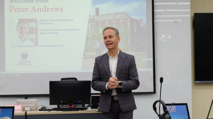 Peter Andrew对北京城市学院国际文化与传播学部优秀教学团队表示感谢,对北京城市学院国际课程班学生在海外的出色表现给予高度肯定,该项目85%的北城毕业生成功申请至QS排名前100名学校深造。北京城市学院2024级国际课程班项目学生全部荣获赫尔奖学金,其中参加“2+2转学分双学位”的梁家良同学获赫尔大学全球留学生大使称号及1.5万英镑专项奖学金,体现了两校联合培养成果。