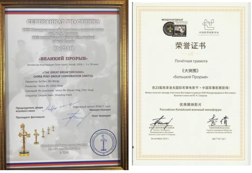 近日,由北京城市学院国际文化与传播学部广播电视编导专业教师杨子萱担任编剧的影片《大突围》荣获第23届俄罗斯奥泽罗夫国际军事电影节“优秀展映影片”奖。荣誉证书由电影节主席及中国世界电影学会会长亲笔签名,并于2025年10月26日正式颁发。