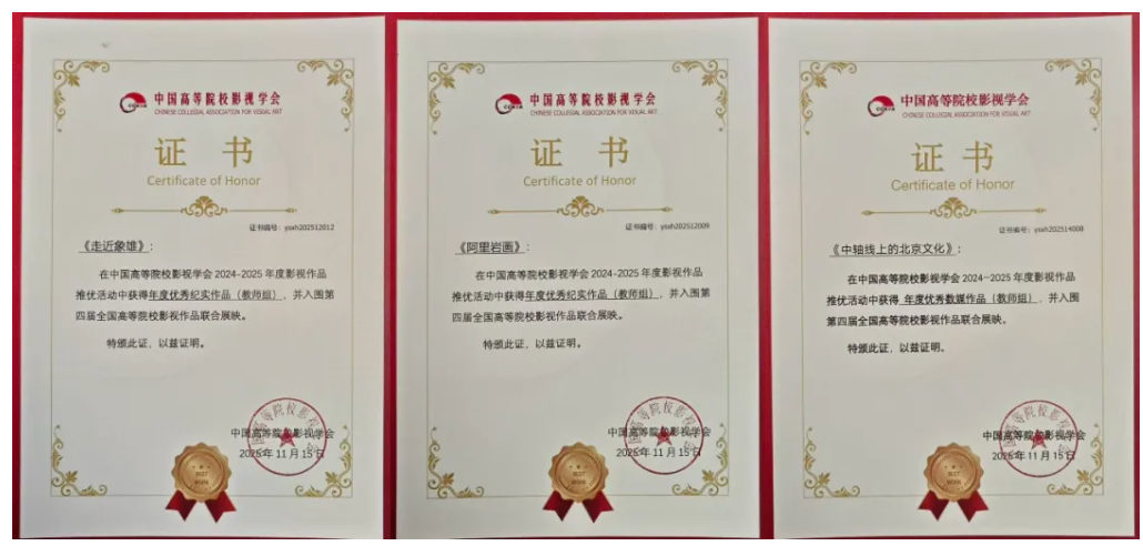 影视作品方面,广播电视编导教研室教师周嵬玮、刘希磊创作的纪录片《阿里岩画》《走近象雄》凭借深厚的文化内涵与精湛的纪实创作手法,获评“年度优秀纪实作品(教师组)”,全国共17项纪实作品入围。广播电视编导教研室教师李琮珩《中轴线上的北京文化》以AIGC创新的数字媒体表达获评“年度优秀数媒作品(教师组)”,全国共12项数媒作品入围。以上三部作品均入围第四届全国高等院校影视作品联合展映,成为展示北京城市学院教师影视创作实力的重要窗口。