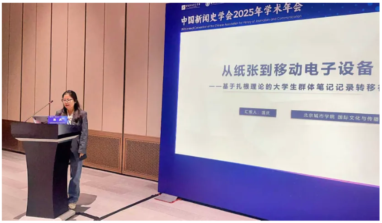 11月21日至23日,中国新闻史学会2025年学术年会在重庆科学会堂举行。北京城市学院国际文化与传播学部传播学教研室教师温庆受邀参加,并在“应用新闻传播学专业委员会”分论坛上宣读题为《从纸质笔记到数字笔记——基于扎根理论的大学生群体笔记记录转移行为研究》的论文。该论文基于扎根理论方法,系统分析当代大学生记笔记方式转变的深层动因,从技术演进与文化变迁的双重视角,深入挖掘笔记记录从纸质到数字转移背后的逻辑机理与时代内涵,不仅拓展了数字社会个体行为转型的理论边界,更为学习类数字设备的研发优化提供了实证参考,对推动数字技术在教育领域的深度应用与推广具有重要实践价值。近年来,北京城市学院国际文化与传播学部始终坚持“科研反哺教学、教学促进科研”的发展理念,高度重视学术氛围营造与科研平台建设,通过搭建多元化科研交流载体,鼓励教师紧盯学科前沿动态,开展特色化、创新性研究。