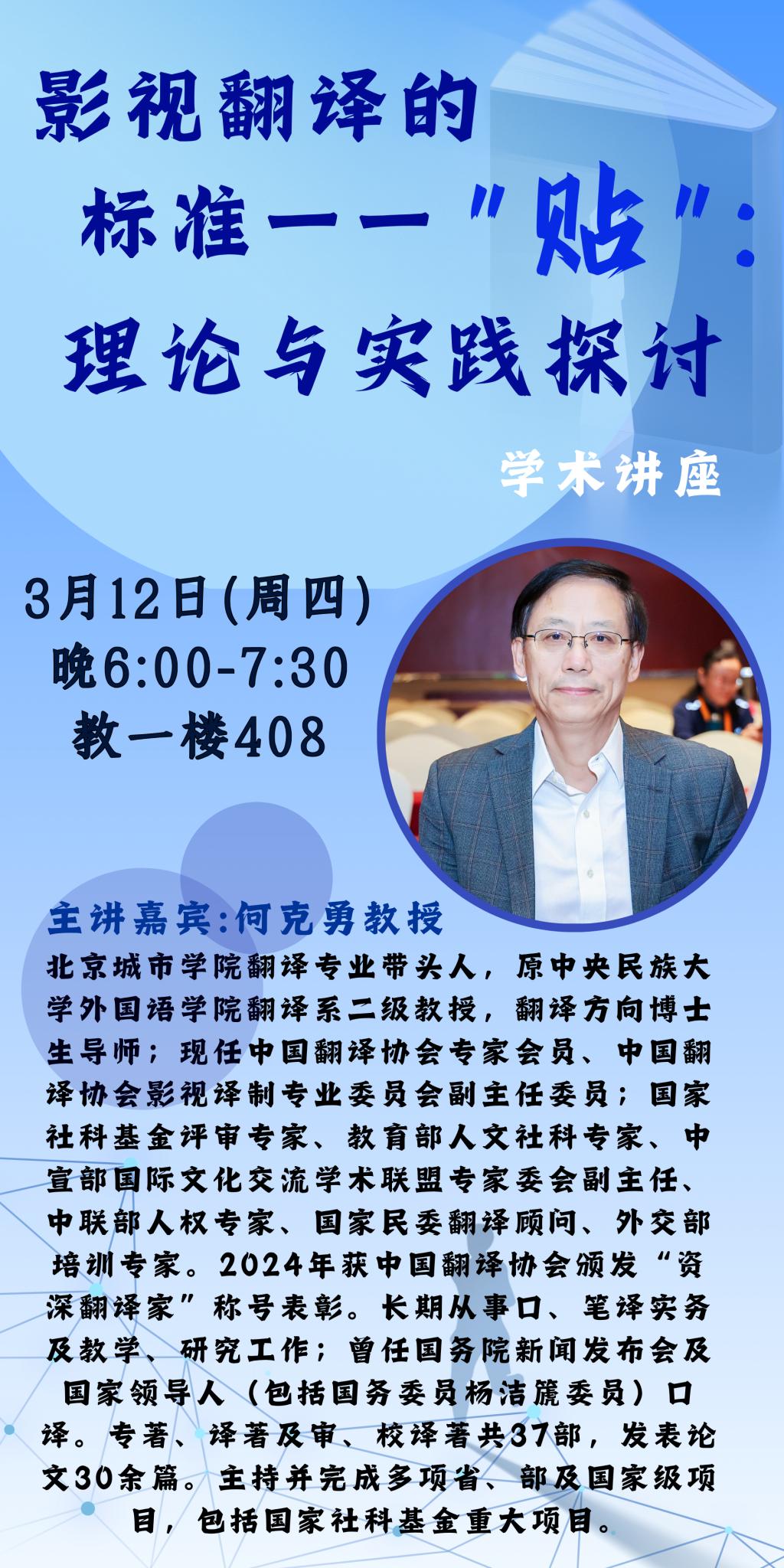 3月12日,北京城市学院国际文化与传播学部翻译专业组织高年级学生开展了主题为“影视剧翻译的标准——‘贴’的理论与实践”的专业讲座,讲座嘉宾是北京城市学院翻译专业带头人何克勇教授,讲座旨在加深同学们对影视翻译领域的了解,提升专业实践能力,以适应国家文化出海与影视译制行业发展的最新需求。