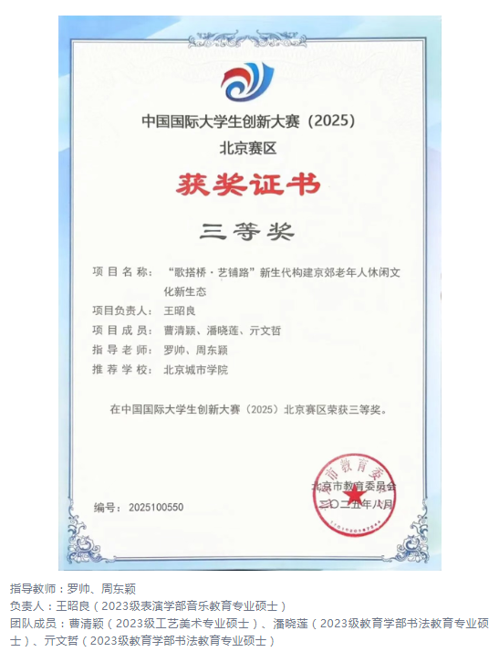 近日,2025年中国国际大学生创新大赛(北京赛区)比赛结果揭晓。表演学部音乐教育专业硕士研究生王昭良带领的团队,凭借其参赛项目 “‘歌搭桥·艺铺路’新生代构建京郊老年人休闲文化新生态”,在激烈的竞争中脱颖而出,荣获研究生创意组三等奖。