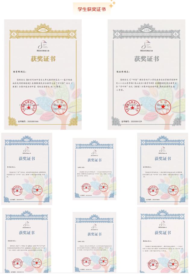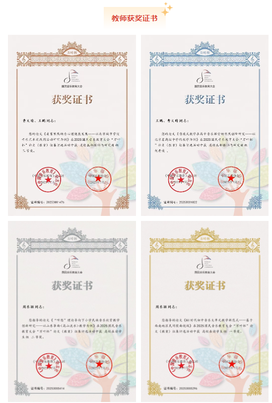 近日,2025国民音乐教育大会 “万叶杯” 论文(教案)征集评选活动获奖名单正式揭晓。我校表演学部音乐教育专业教师团队与学生群体表现亮眼,凭借扎实的教研能力、专业的育人水平及创新的学术探索,在全国赛事中斩获多项荣誉。