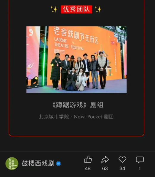 近日,备受业界关注的第三届鼓楼西高校剧团公益展演在北京隆福寺街区圆满落幕。作为国内青年戏剧领域的重要交流平台,本届展演以“传承·创生”为核心主题,吸引了全国多所高校剧团踊跃报名。表演学部表演(影视表演)专业“Nova Pocket剧团”凭借原创独幕剧《蹲踞游戏》的真诚表达与创新呈现,成功突围入选15部展演精品,并获得“优秀团队”荣誉称号。学生们在展演中精彩亮相,用青年视角解读现实生活,收获了现场观众、主办方及社会各界的广泛赞誉,为校园文化增光添彩。我校剧团此次突围亮相,不仅展现了北城学子在戏剧创作、表演领域的扎实功底与创新思维,更彰显了青年一代关注现实、传递善意、勇于担当的精神风貌。