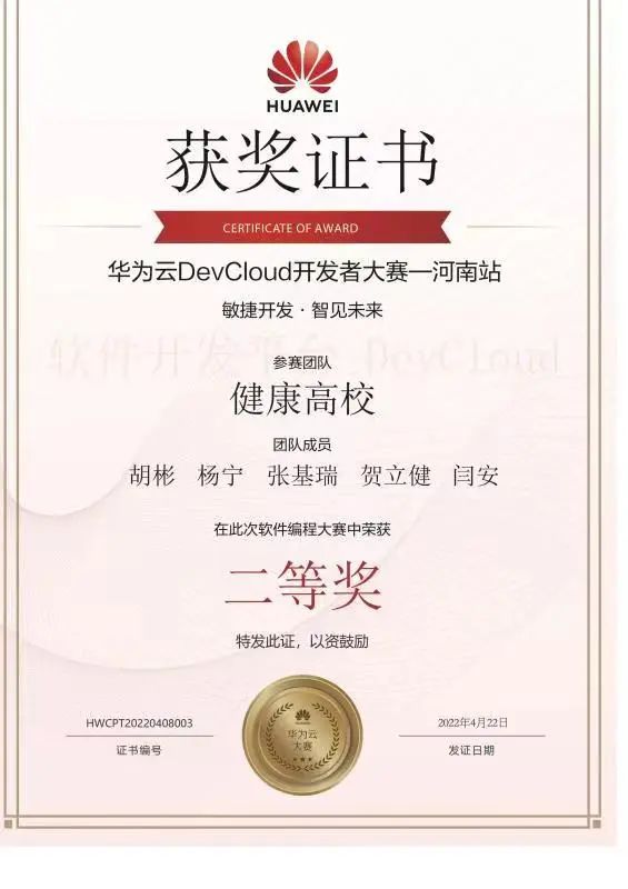 经过激烈角逐,我校阿里云大数据学院19软本3胡彬、19软本3杨宁、19软本3张基瑞、19软本1贺立健、18软本2闫安等5名同学组成的“健康高校团队”获得大赛二等奖。