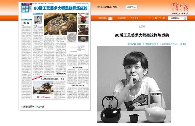 《中国青年报》深度报道我校校友青年工艺美术大师马小申 2014年12月9日,《中国青年报》以“80后工艺美术大师是这样炼成的” 为题详细报道了我校2005届艺术设计专业毕业生马小申,报道以其今年的APEC国礼的设计角逐过程为主要内容,详细介绍了马小申的成长经历、工作理念,成为年轻工艺美术大师的心路历程!